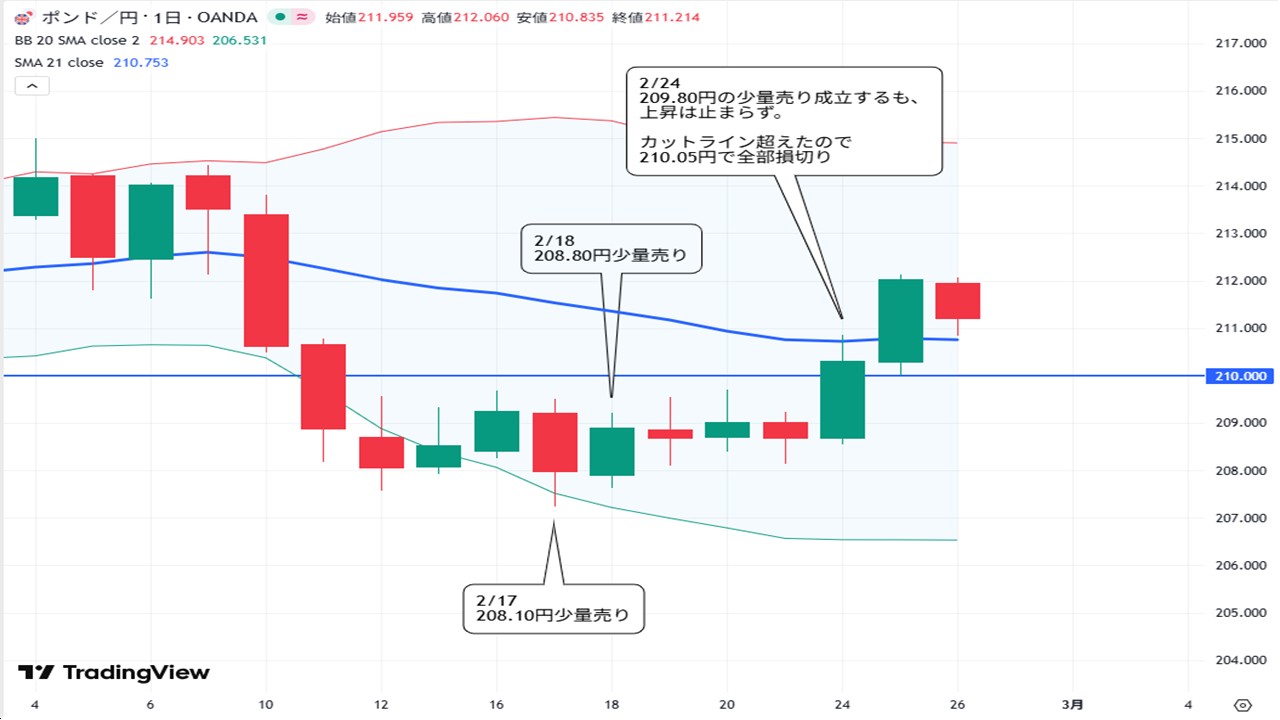 210円をバックに売り上がる方針でしたが、結局円安の流れに押されてポンド円も上昇、ストップ水準手前の売り209.80円もこなすと、そのまま210円に乗せてしまい、210.05円で損切りとなりました。