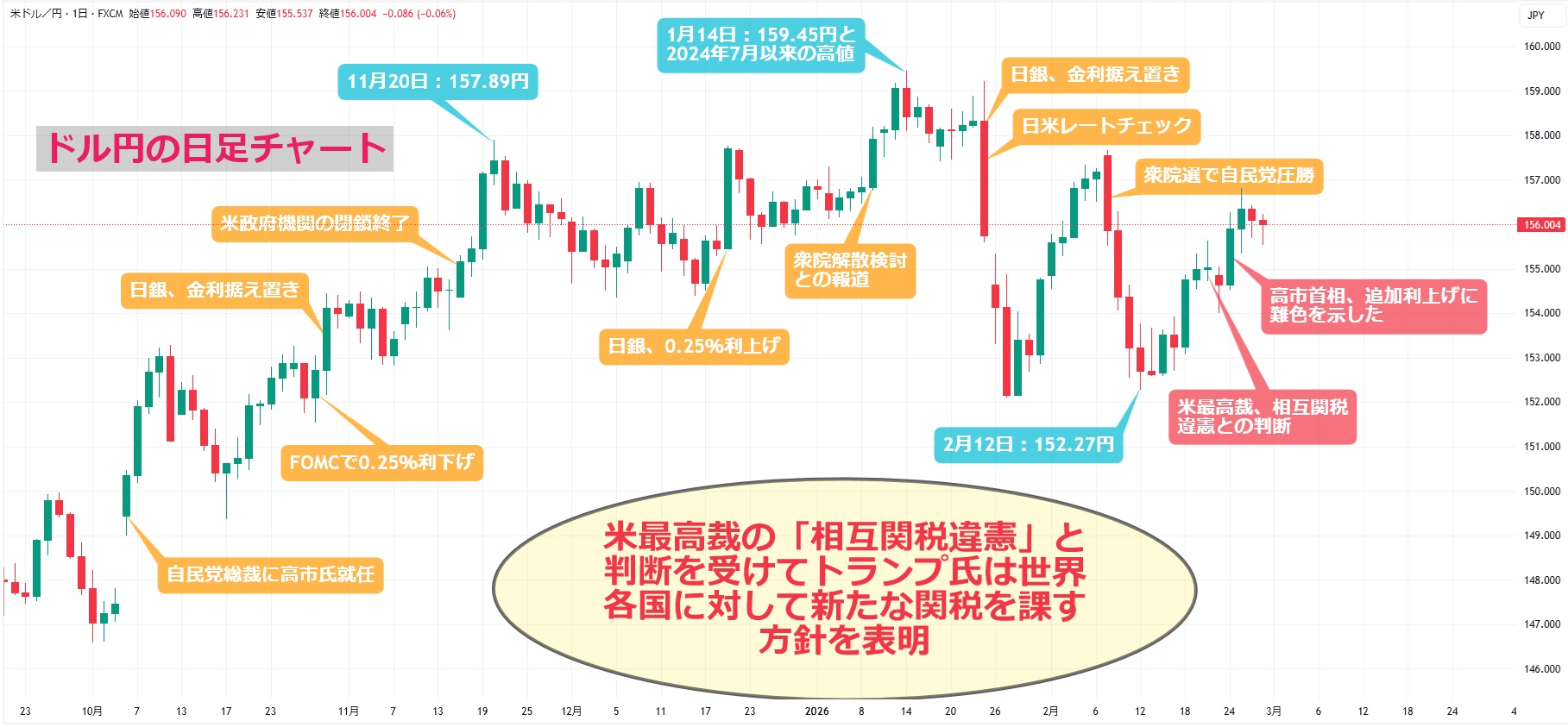 今週のドル円相場は底堅い展開となりました。米連邦最高裁は20日、国際緊急経済権限法(IEEPA)に基づく相互関税などについて違憲との判断を下しましたが、これを受けてトランプ米大統領は世界各国に対して新たな10%の関税を課す方針を提示。21日には税率を15%に引き上げると表明しました。米関税政策を巡る不確実性の高まりから、東京市場が休場となる23日のアジア市場では一時154.00円まで値を下げました。なお、トランプ氏は23日に自身のSNS上で「関税措置を違憲とする米最高裁の判断を受けて『駆け引き』をしようとする国はこれまでよりもはるかに高い関税に直面する」と警告しています。かなり怖い脅しです。