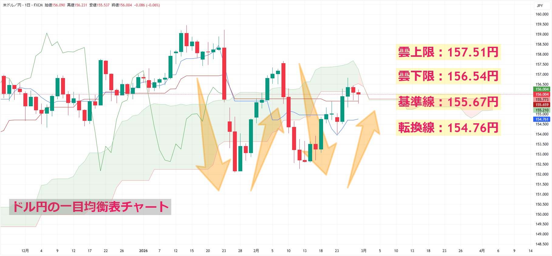 ドル円の一目均衡表チャートを見ると