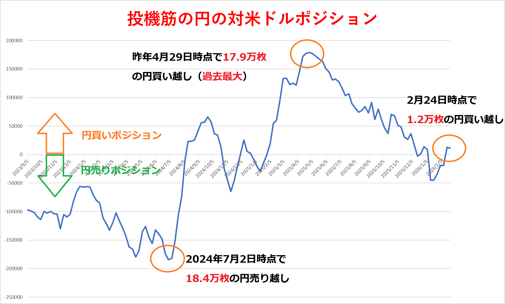 投機筋の円のポジションは昨年7月2日には18万4223枚の円売り越し(ドル円のロング)となり、2007年6月(18万8077枚)以来の高水準を記録していましたが、そのあとは一転して円買いポジションを構築する動きが優勢となり、4月29日には17万9212枚と過去最大を更新しています。ただ、それ以降はその動きが反転し、現在はほぼフラット(大きなポジションの偏りがない状態)となっています。