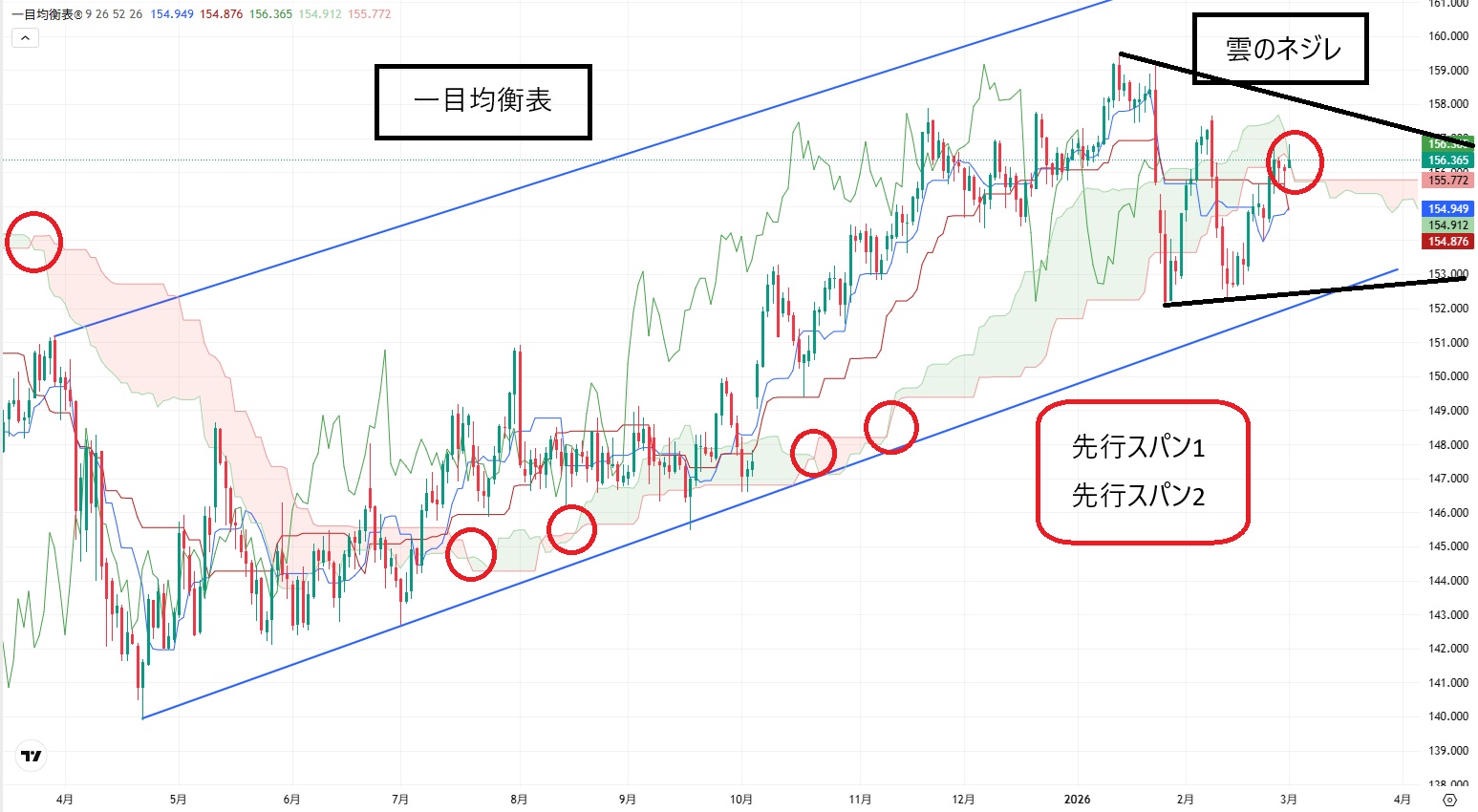 一目均衡表では、3月2日に、雲が156.38円で交差、ネジレたことにより、先行スパン1が、先行スパン2を下回り、「買い時代」から「売り時代」へ移行する可能性が示唆されています。