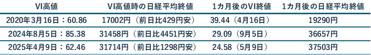 2020年以降、何度か日経平均VIが急騰するケースがありました。その後の推移をみてみると、次のような結果になります。