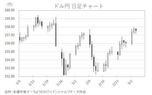 ドル円は週明けの156円近辺から急伸。3月3日には直近の上値の節目だった2月9日高値157.76円を上抜け、一時157.97円まで上昇しました。1月23日以来となる158円回復目前まで水準を切り上げています(図表参照)。