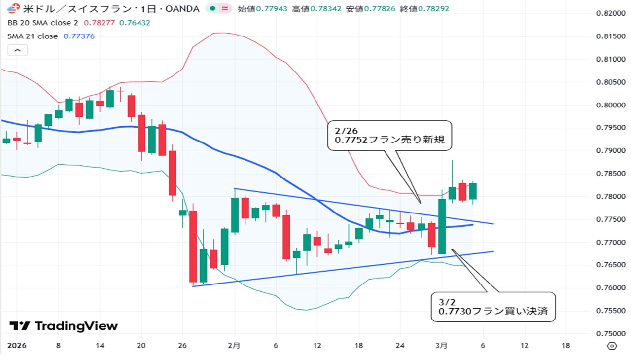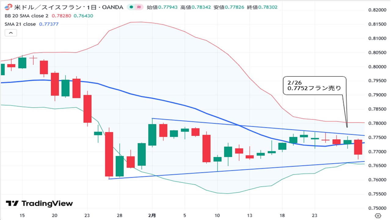 ドル/スイスフラン、三角保合を見て売ってみる
