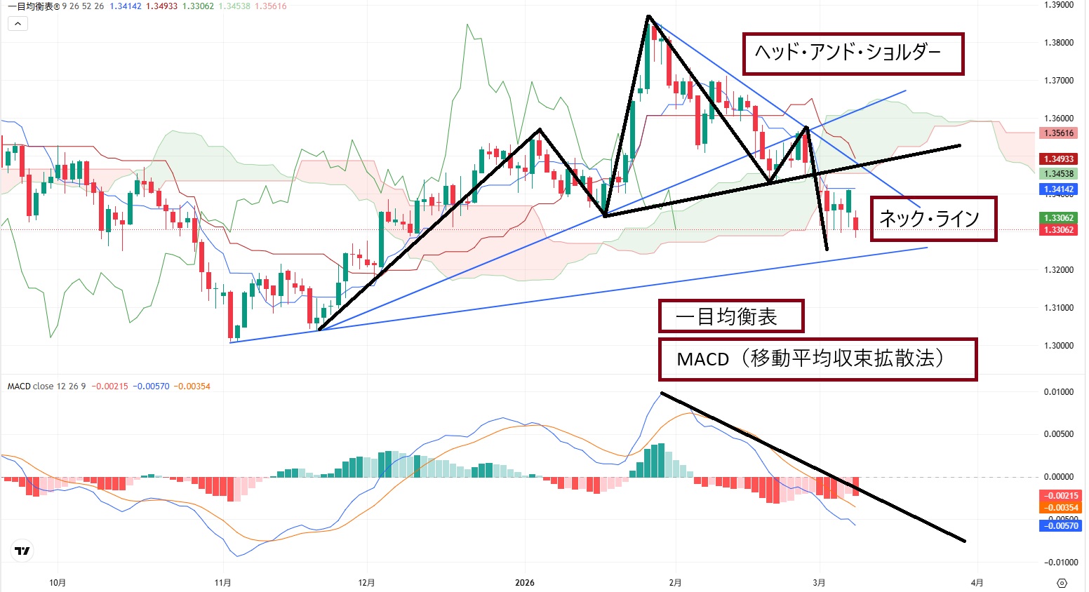 中期的には、下落トレンドの第3波動で2022年9月に1.0356ドルでまで下落した後の調整第4波動による上昇トレンドを形成中でしたが、「ヘッド・アンド・ショルダー」の完成により中期的な支持線を下抜けています。
