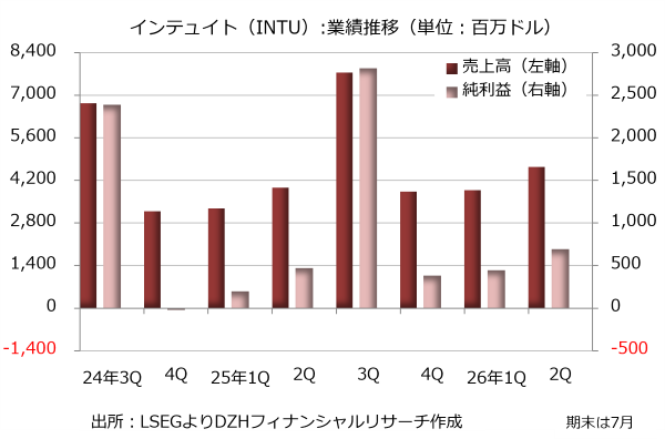 決算発表時のガイダンスでは2026年2-4月期(非GAAPベース)の売上高を85億2000万-85億5300万ドル(前年同期は77億5400万ドル)、営業利益を45億8400万-46億400万ドル(同43億4300万ドル)、EPSを12.45-12.51ドル(11.65ドル)と予想しています。米国では確定申告の提出期限が4月半ばに設定されているため、2-4月期は例年、売上高と利益が一気に拡大します。