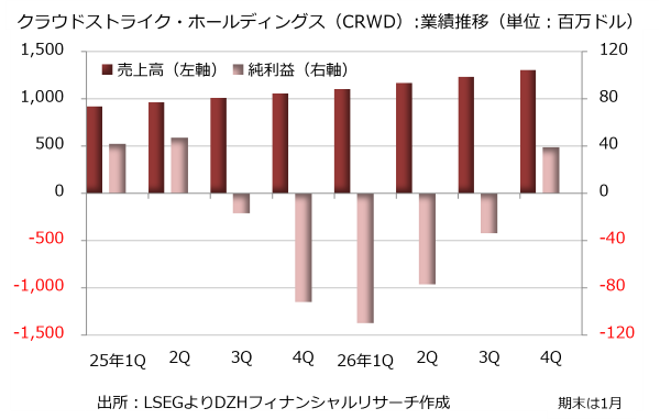 サイバーセキュリティーのクラウドストライク・ホールディングス(CRWD)が発表した2025年11月-2026年1月期決算は売上高が前年同期比23%増の13億500万ドル、純利益が3900万ドル(前年同期は8600万ドルの純損失)となりました。非GAAP(米国会計基準)ベースのEPS(1株利益)は1.12ドルで、LSEGがまとめた市場予想の1.102ドルを1.6%上回っています。