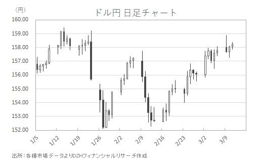 為替市場も影響を受けています。地政学リスクが高まる局面では「有事のドル買い」が入りやすく、ドル円は159円乗せをうかがう状況となりました(図表参照)。さらに、日本はエネルギー輸入国であるため、原油高は貿易収支の悪化を通じて円売り要因となります。このため、原油上昇局面ではドル高・円安が同時に進みやすくなります。