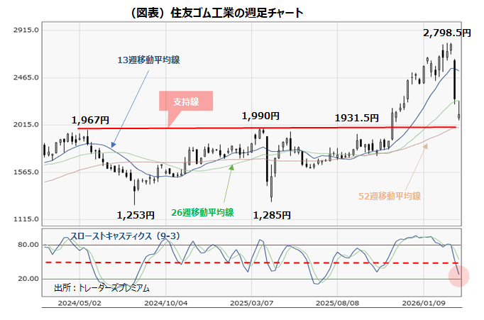 スローストキャスティクスが次に20%水準を上回ることができれば、リバウンド局面に入る買いシグナルとなります。52週移動平均線や支持線上を維持できるかも複合的に判断し、押し目処を見極める局面に入ってきたといえそうです。