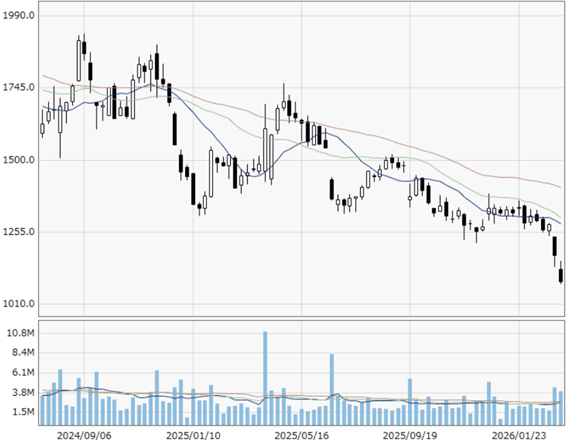 一方、株価は業績の堅調さとは対照的に、足元では調整局面が続いています。2026年3月16日の終値は1097円となっており、3月初旬の1200円台から一段落した水準にあります。