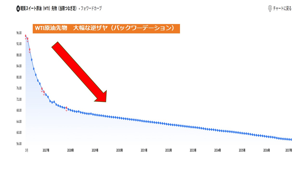 価格の歪み:現物または直近で受取れる原油にプレミアムがつき先の原油の方が安く取引される。