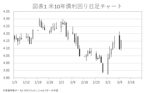原油市場では、ホルムズ海峡の通航改善期待もあるものの、依然として供給不安が拭えず、ウェスト・テキサス・インターミディエート(WTI)原油先物は1バレル=92ドル後半で乱高下しています。原油高は米国のインフレを押し上げ、米連邦準備理事会(FRB)の利上げ観測を後退させる一方、ドル高・米金利上昇の「悪いドル高」現象を引き起こしています。米10年債利回りは3.9%台から4.2%台へ持ち直しました(図表1)。「米中首脳会談延期」により不透明な環境から脱しにくく、景気後退やスタグフレーションへの懸念がくすぶっています。