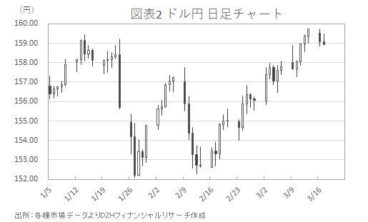 ドル円は、原油価格や地政学リスクに連動して上下動を繰り返しています。ホルムズ海峡の通航改善期待で一時反落する場面もありましたが、原油先物の再上昇、米金利高を受けて159円半ばまで上昇しました(図表2)。ユーロドルもドル買いの流れを受けつつ、米株高や原油価格の変動に連動して日々上下。ユーロ円やクロス円も、株高に伴う円売り・ユーロ買いでじり高の展開が続き、「米中首脳会談延期」が市場心理に影響している様子です。