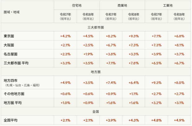 都心部以外の伸びが相対的に低く、人口集中による影響が顕著と言えます。ただ、大手半導体メーカーの工場が進出した地域(熊本県など)では、関連企業の事務所や従業員向けの住宅需要が激増したため住宅地・商業地・工業地ともに高い上昇が見られるようです。
