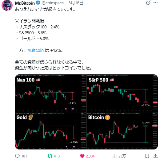 イラン戦争が始まってから、主要な米株指数や金(ゴールド)は下落した一方、ビットコインが12%上昇しているとの指摘です。