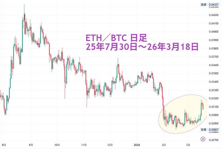 ETHの強弱を測るとき、対円やドルだけでなく、対BTCのチャートをみると分かりやすいかもしれません。ETH/BTCは昨年8月後半を上値に下落が続き、今年2月には8月高値から約35%低下した水準まで売り込まれました。