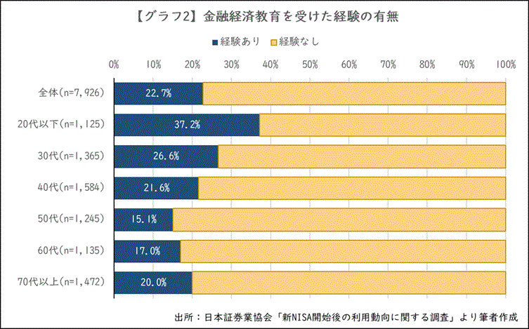 「投資は勉強しなければならないもの」というイメージがありますが、新NISA利用者のうち、金融経済教育を受けた経験のある人は22.7%でした。年代別では【グラフ2】のとおりです。