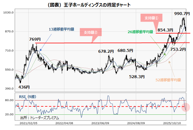 26週移動平均線の水準は昨年9月につけた高値(854.3円)の支持線①にも近く、強い下値の節目と考えられます。今週以降で下げ止まることができるかが注目ポイントになります。