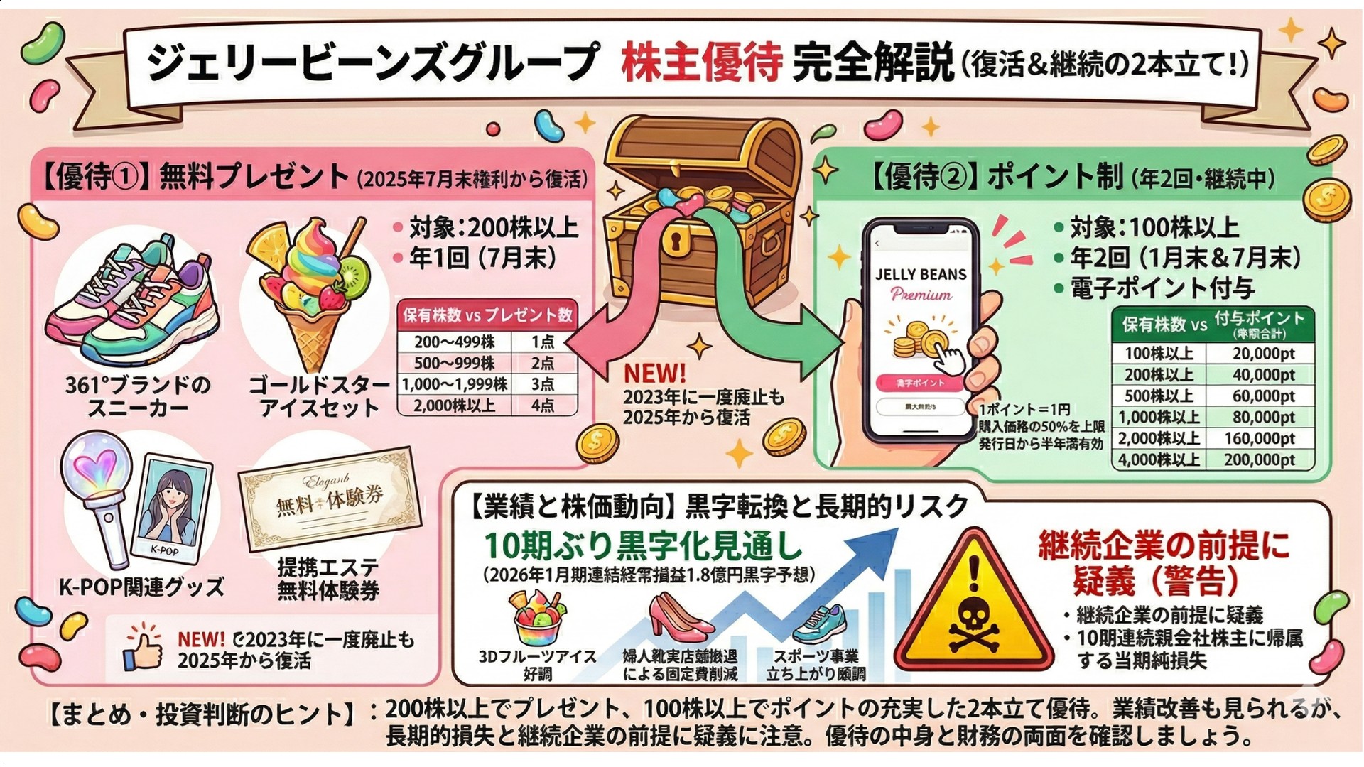 スニーカー・アイスセット・K-POPグッズなどが株数に応じてもらえる内容で、200株以上が対象です。従来からのポイント制優待(年2回・100株以上)も継続されており、現在は2本立ての構成になっています。