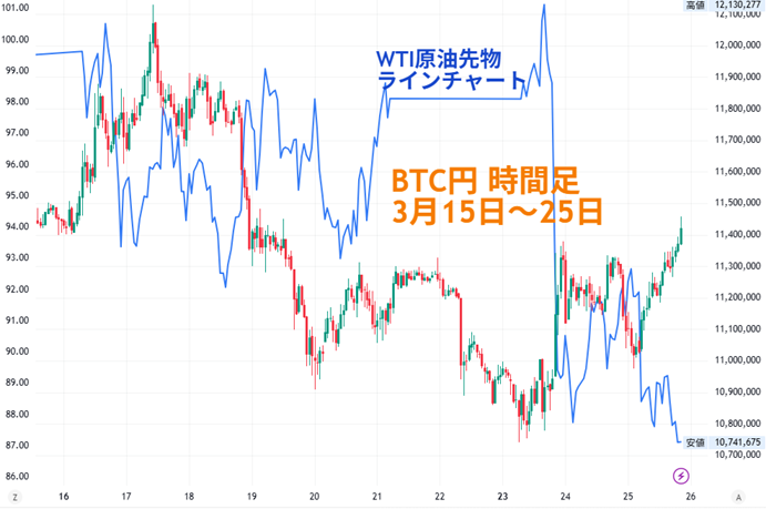 この1週間もイラン戦争を巡る報道で、BTCも神経質な動きが続きました。原油相場の上下に振らされる中、BTC円は1075万円前後を下値に1140万超えまで切り返しました。BTCドルが6万7400ドル前後から7万2000ドル付近まで上昇しました。
