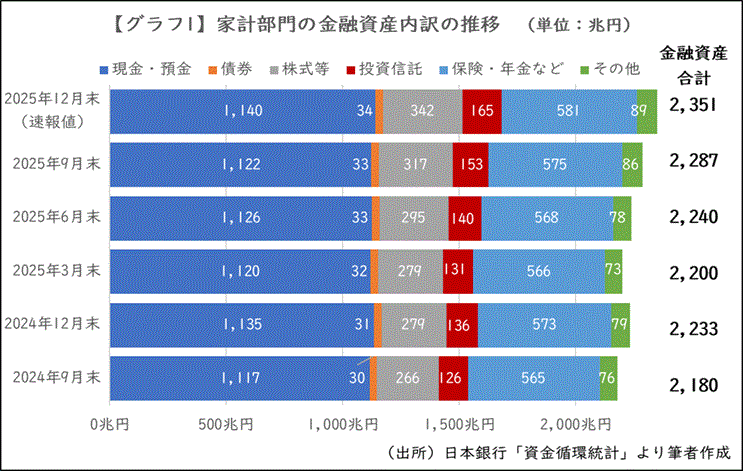 【グラフ1】は、2025年12月末までの6四半期について、家計の金融資産の内訳の推移を示しています。2025年12月末(速報値)は、9月末に比べて64.4兆円増え、前年の12月末と比べると117.9兆円増加しました。