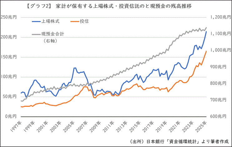 【グラフ2】は、家計が保有する上場株式等と投資信託、そして現金・預金(右軸)の残高について、データをさかのぼることができる1997年12月末からの推移を示しています。