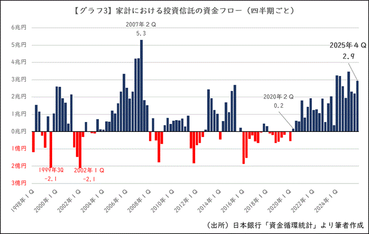 定期預金は、2016年1~3月期から35四半期にわたって純流出でしたが、2024年10~12月期に純流入にいったん転じ、その後は流入と流出を繰り返しています。長く続いた低金利時代を終え、見直されている兆しはあるものの、持続性という点では投資信託に比べるとやや弱い印象です。