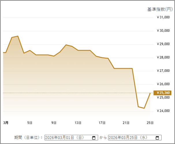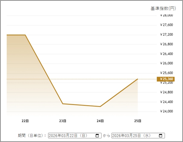 ところが2026年3月に激化したアメリカとイランの戦争状態ですが、上記のチャートのように金は「横ばいトレンド」を継続しています。上記チャートは左側が3月上旬、右側が3月下旬の1カ月のチャートです。傾向としては3月23日に大きく下落したものの、紛争は一時的ではなく長期的なもの。いわゆる「有事の金」にしては緩やかな動きで、本来は「乱高下」が想定されるものです。