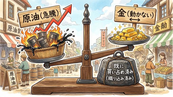 なお2026年の貴金属は素材によって別々の動きをすることも多くなっているのですが、今回の原油との関係性においては、金も銀もプラチナも概ね同じような動きをする印象があります。「金=貴金属」と言い換えても問題ないでしょう。