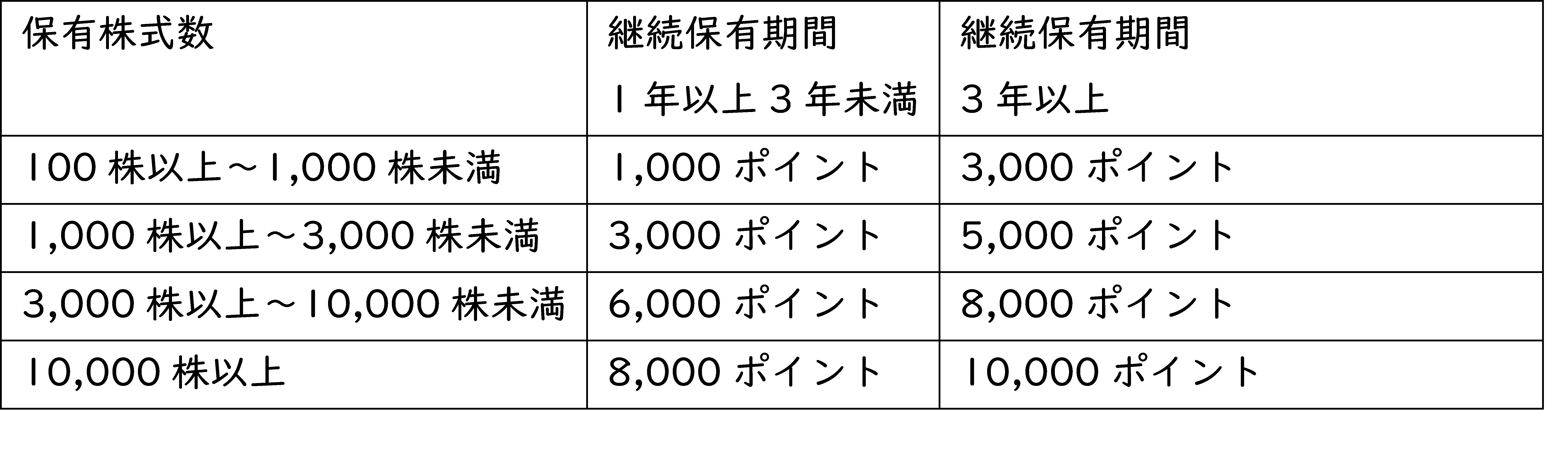 100株以上を1年以上継続保有(3月末日および9月末日現在の株主名簿に100株以上の保有記録が、同一株主番号で3回以上連続の記載または記録がある)ことが要件です。