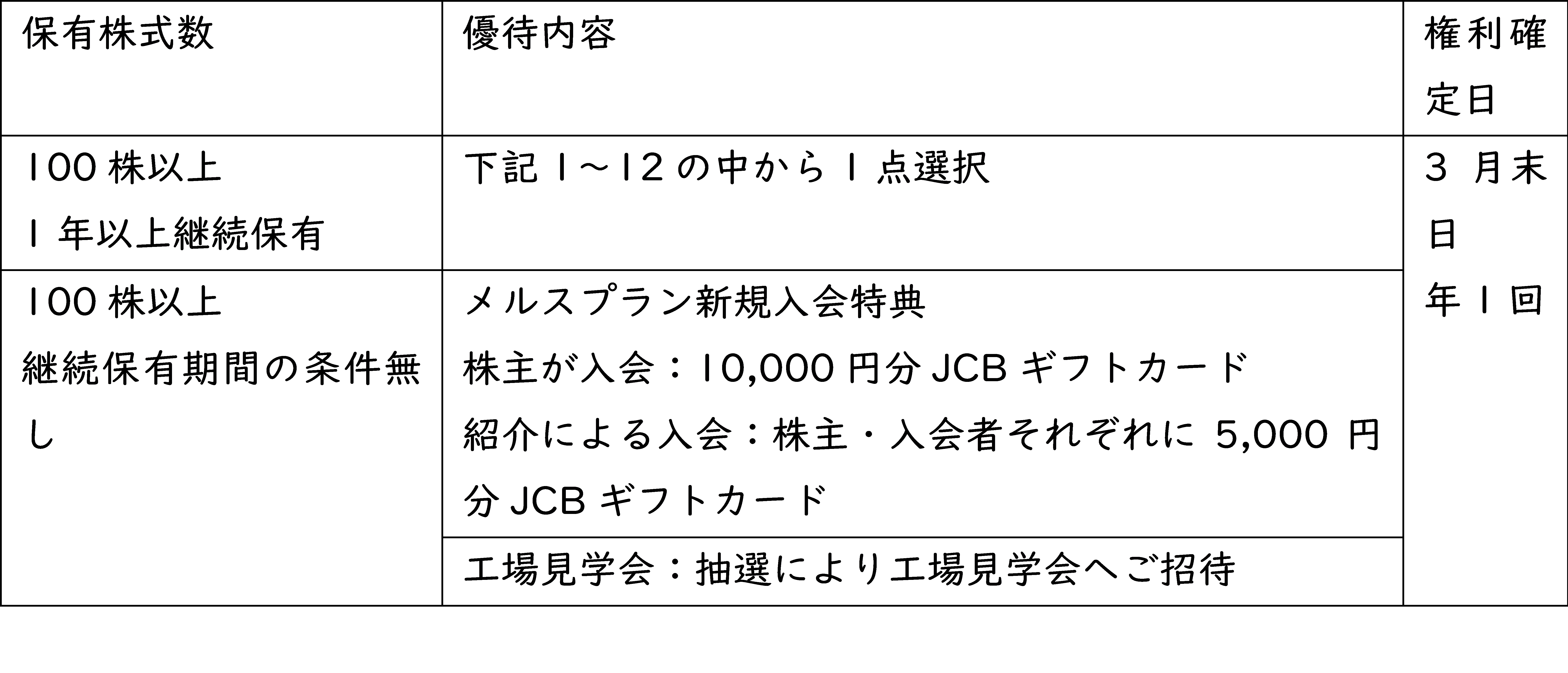 株主優待は、毎年3月末現在の株主名簿に記載または記録された100株以上を、1年以上継続保有している株主が対象です。