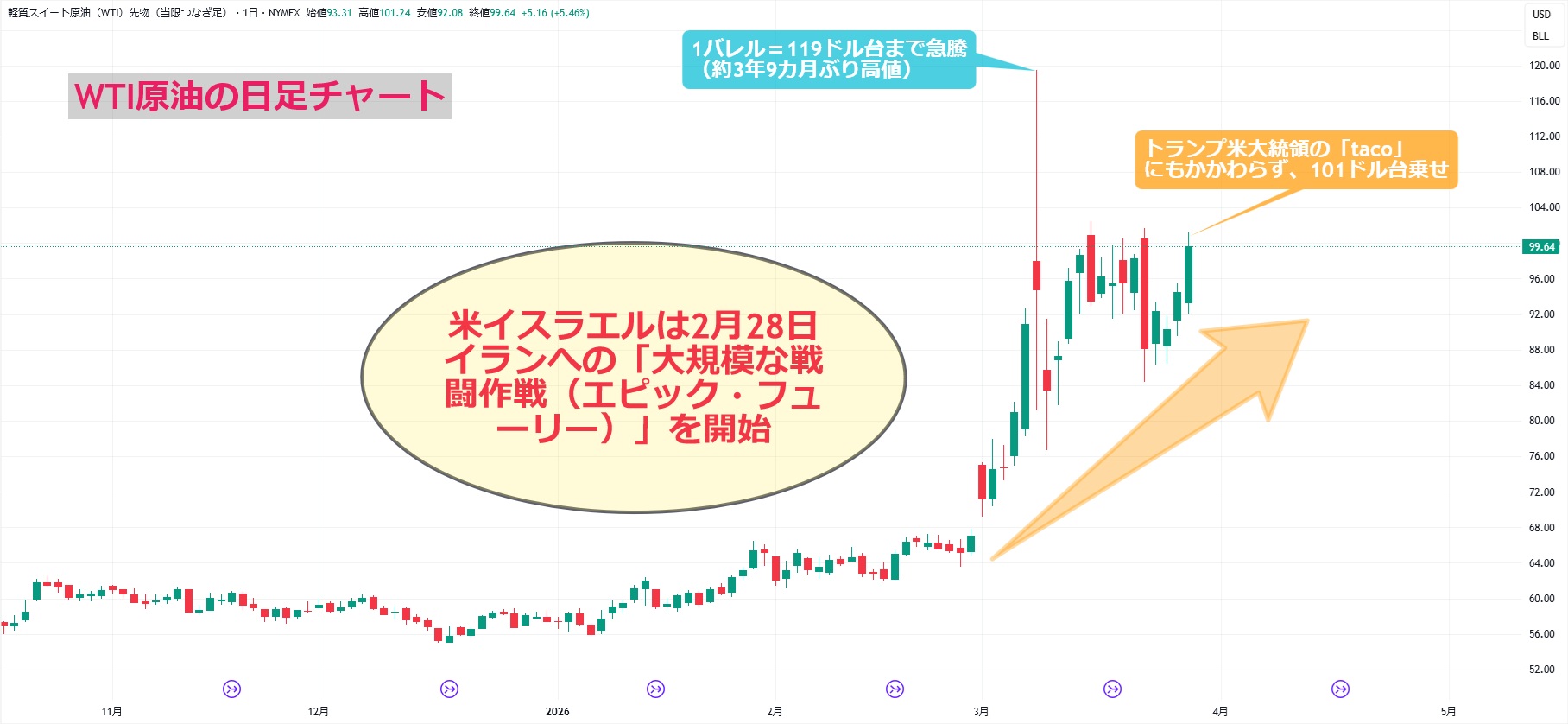 今週のマーケットの値動きを見ると、この「TACO」がむしろ相場の乱高下と投資家のリスク・オフ姿勢を強めているようにみえます。また、2025年の貿易戦争下では関税引き上げが米国のインフレ圧力の高まりにつながるかどうかは不透明でしたが、今回は原油などエネルギー高に起因するインフレ波及が鮮明となっています。