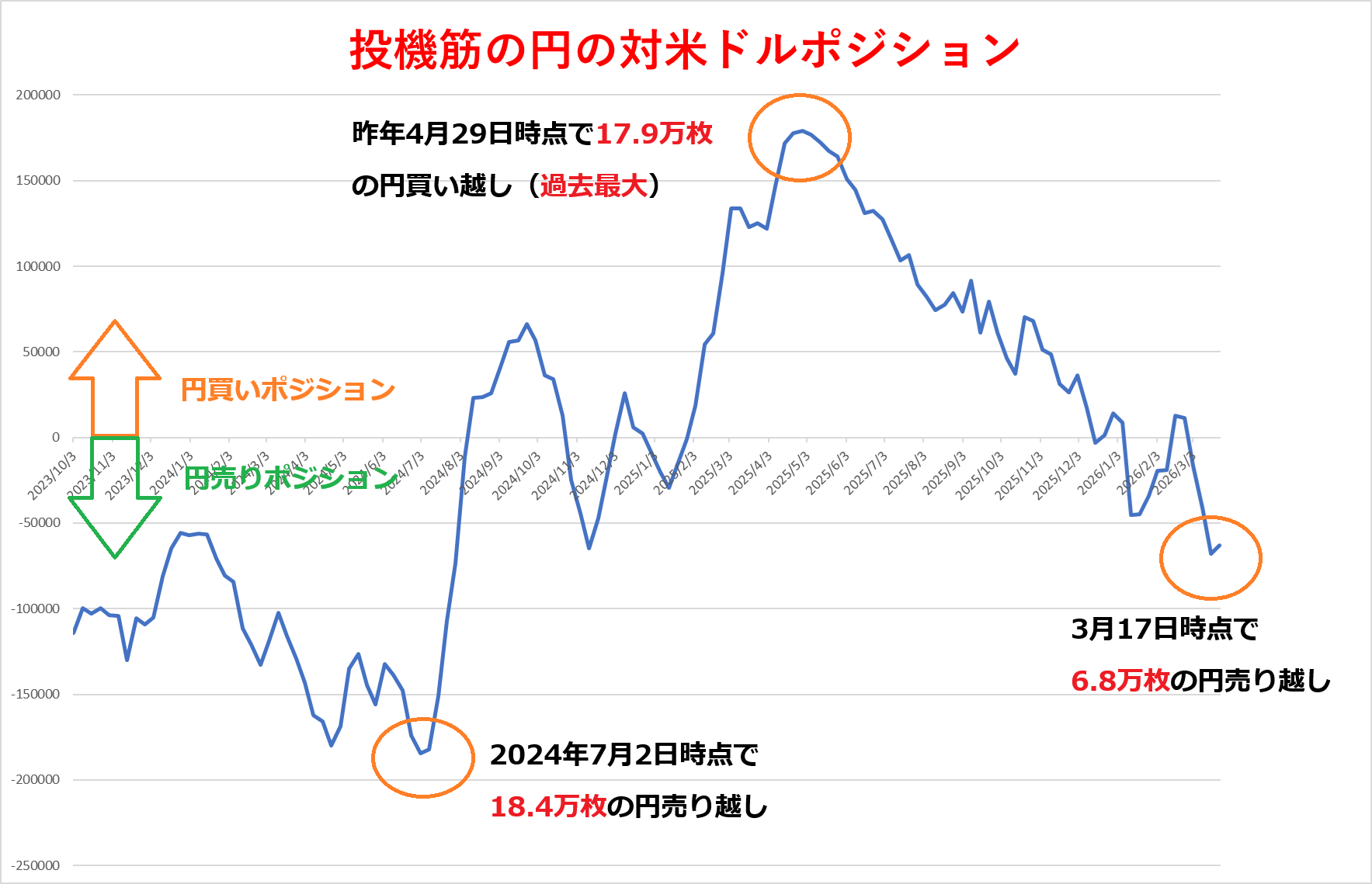 なお、投機筋の円のポジションは昨年7月2日には18万4223枚の円売り越し(ドル円のロング)となり、2007年6月(18万8077枚)以来の高水準を記録していましたが、そのあとは一転して円買いポジションを構築する動きが優勢となり、4月29日には17万9212枚と過去最大を更新しています。ただ、それ以降はその動きが反転。投機筋の円売りポジションが6万枚を超えた水準で推移しています。