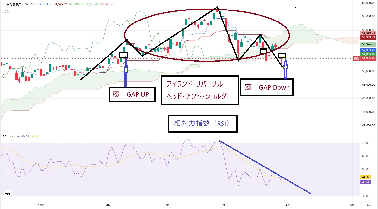 日経平均株価のテクニカル分析では、2月9日に高市政権の衆議院選挙大勝を受けて窓(54253円~55018円)を空けて、2月26日には史上最高値の59332円まで上昇しました。