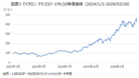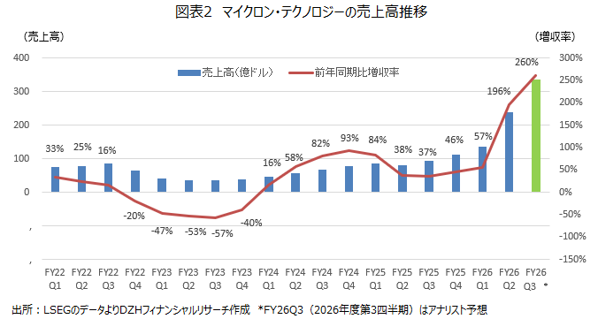 マイクロン・テクノロジーの2026年度第2四半期(12-2月)決算は、10四半期連続の増収となり、第3四半期(3-5月)についても前年同期比260%増の大幅増収見通しが示されましたが、株価は利益確定売りが優勢となりました。