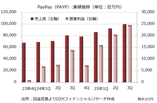 一方、2025年4-12月期決算ではさらに業績拡大が顕著です。売上高は前年同期比26%増の2784億7800万円、純利益は3.8倍の1015億2100万円に急増しました。売上高の内訳は決済部門の取引・サービス収入が25%増の1632億5100万円、金融サービス部門の取引・サービス収入が9%増の220億7400万円でした。