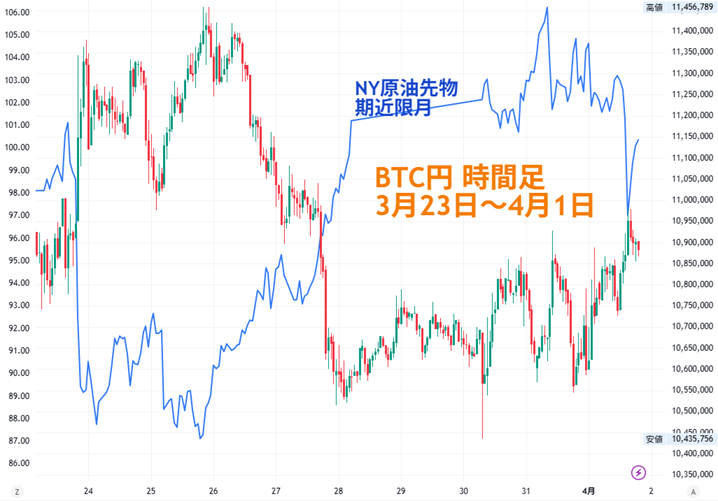 この1週間もイラン紛争の関連報道で、BTCは不安定な動きでした。BTC円は3月25日つけた1145万台を直近高値に、中東情勢の緊迫を受けたリスク回避の強まりで、27日夜中には1150万円手前まで下げ幅を広げました。