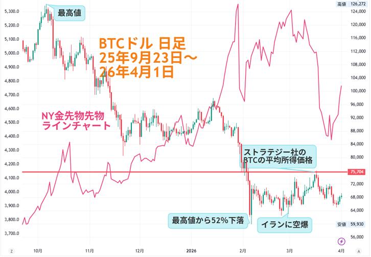 その後BTC相場は、停戦への思惑の強弱で上下しながら、戦争終結への期待感が高まると水準を切り上げています。BTC円は1095万円超え、7万2000ドルから6万6000ドル割れしたBTCドルが、6万9000ドル超えまで切り返しました。