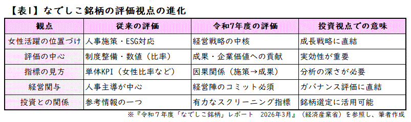 なでしこ銘柄は、女性活躍を軸に企業価値向上を実現している企業を選定する制度です。過去の本コラムでも取り上げてきたなでしこ銘柄ですが、令和7年度は特に、「質」への評価がより深まった点が特徴です。単なる制度の有無や女性比率の数値といった形式的なものから、企業価値への貢献という実質的なものへと評価軸が進化しています【表1】。