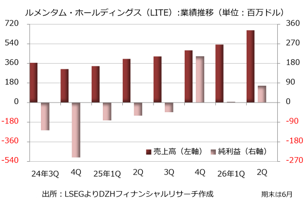 前述のコヒレントとの共通点は多く、データセンター向けの光学製品の需要増でともに業績が急成長しています。エヌビディアがコヒレントと同様、ルメンタムにも20億ドルを出資し、業務提携に踏み出した点も共通しています。