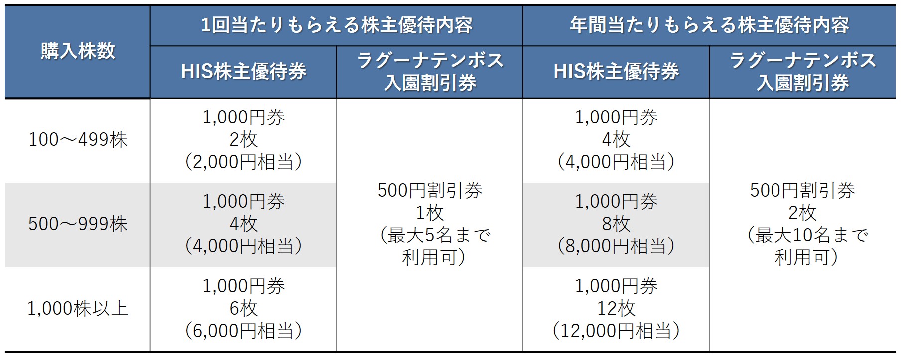 HISの株主優待は、毎年4月末と10月末の権利確定日に、100株以上の株式を保有する株主に対して、保有株数に応じて贈呈されます。贈呈される株主優待の内容は、HIS株主優待券とラグーナテンボス入園割引券です。