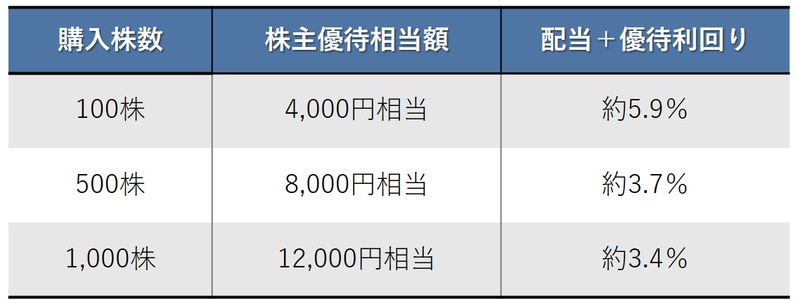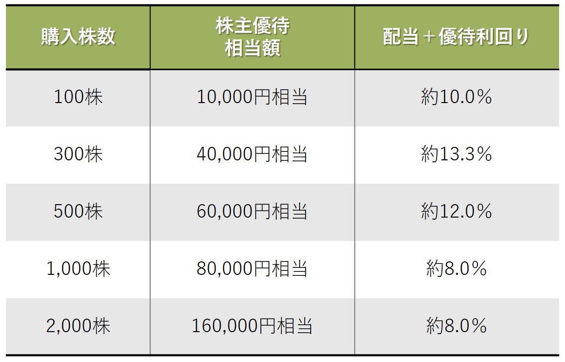 保有株数に応じた、配当と優待を合わせた利回りの一覧は、下記の表をご参考ください。