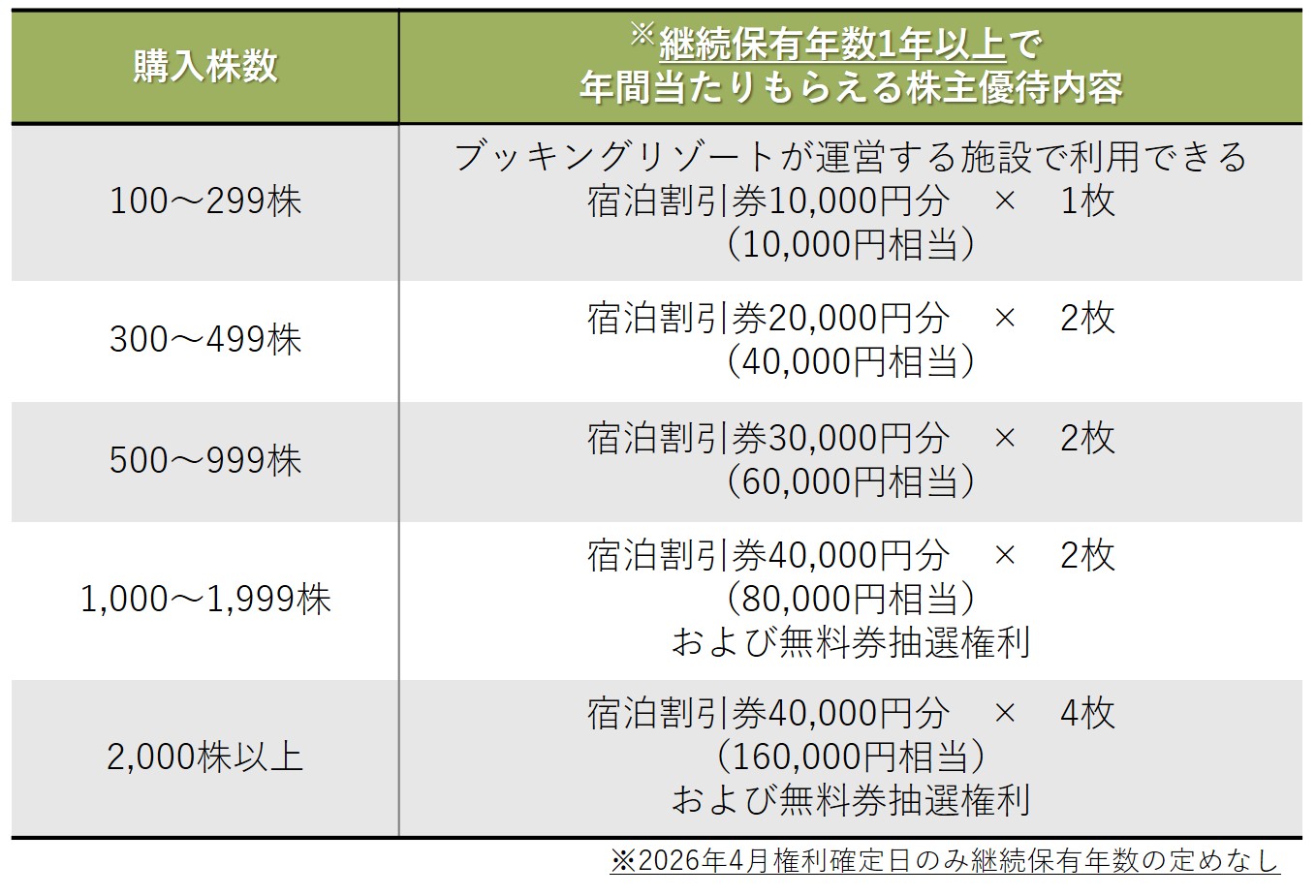 ブッキングリゾートの株主優待は、毎年4月末の権利確定日に、100株以上の株式を1年以上保有する株主に対して、保有株数に応じて贈呈されます。贈呈される株主優待の内容は、ホテルの宿泊割引券です。