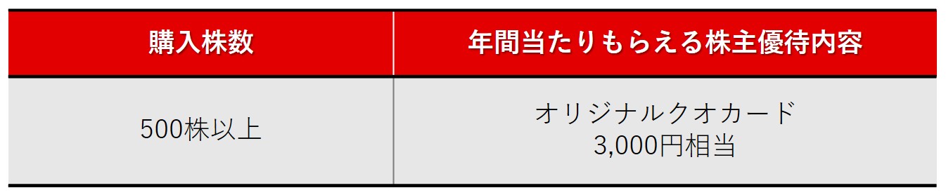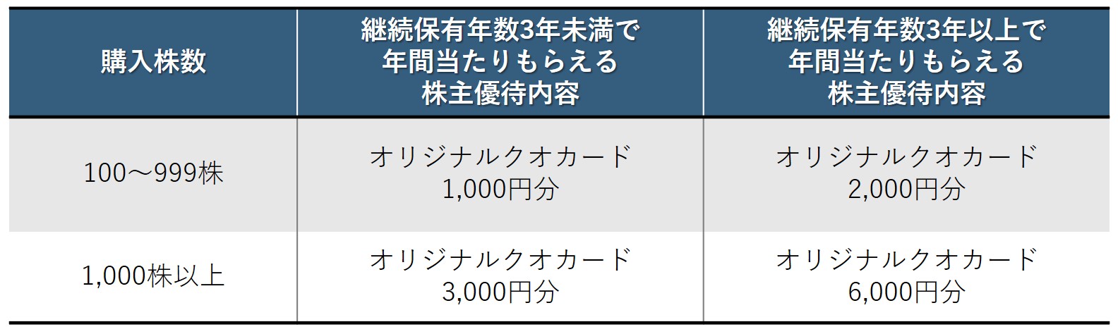 保有株数および保有年数に応じて贈呈される株主優待の内容は、下記の一覧表をご確認ください。