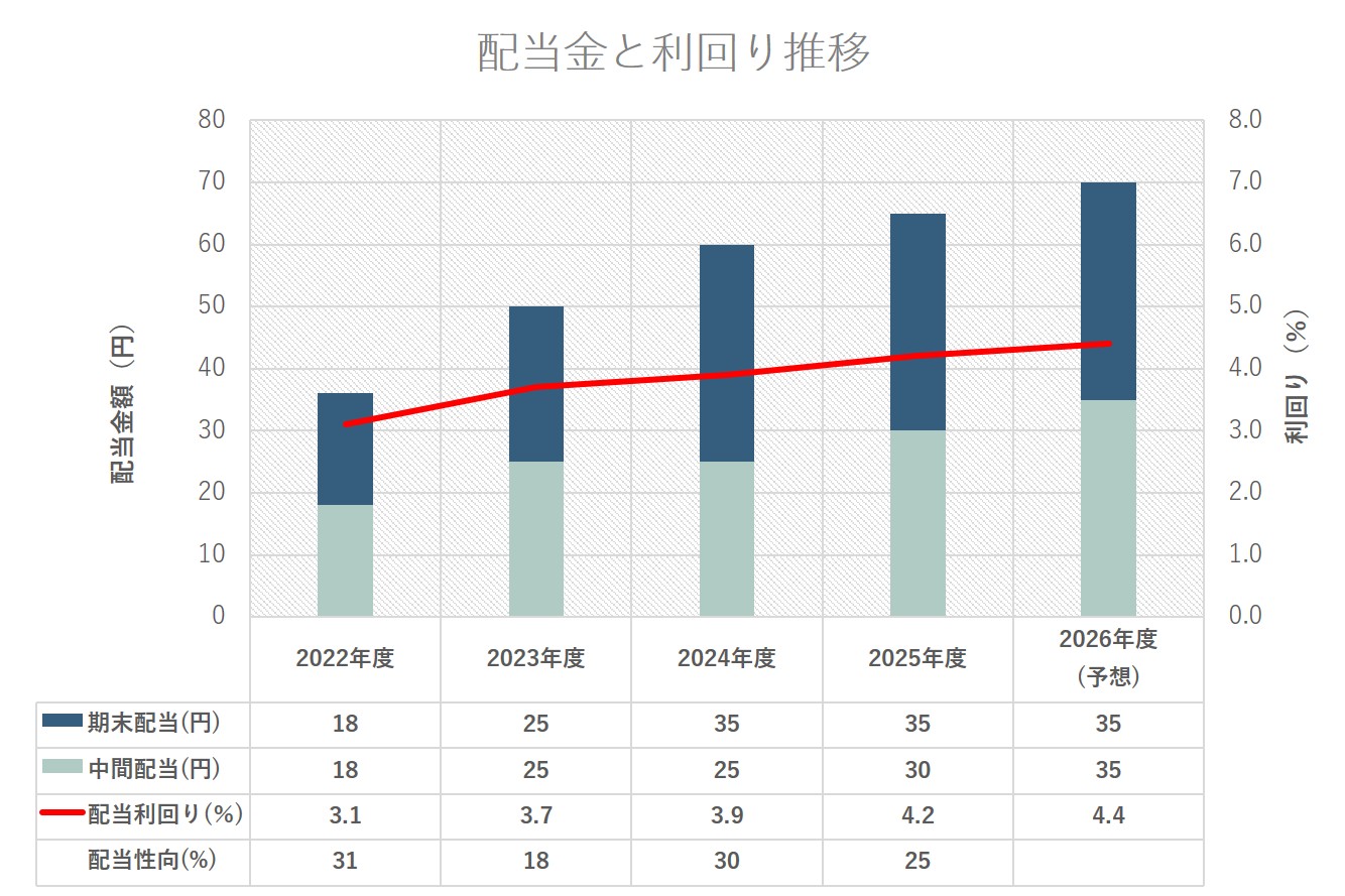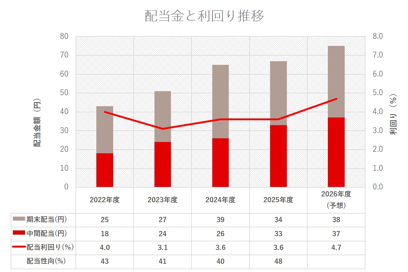 2026年度の配当金は、4月末の中間配当で35円、10月末の期末配当で40円の、年間1株当たり75円となる予想です。この金額は、2023年度の36円、2024年度の50円、2025年度の60円から4期連続で増配しています。