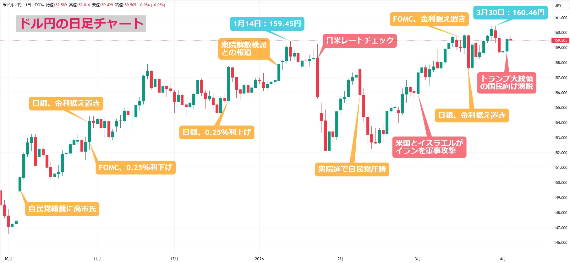米国とイスラエルによる電撃的なイランへの先制攻撃から1月以上が経ちましたが、事態が収束に向かう兆しは見られず。WTIや北海ブレントなど原油価格は高止まりし、インフレ再燃への懸念が強まる日が続いています。結局、今週も原油高・株安・ドル高の流れが継続することとなりました。ドル円は週明け3月30日の東京市場で一時160.46円と2024年7月以来の高値を付けています。ただ、三村財務官が「そろそろ断固たる措置が必要となる」などと述べ、足もとの円安進行を強くけん制すると一転下落。その後も政府・日銀による為替介入への警戒感から円買い・ドル売りが優勢となり、1日には158.28円まで下押ししています。