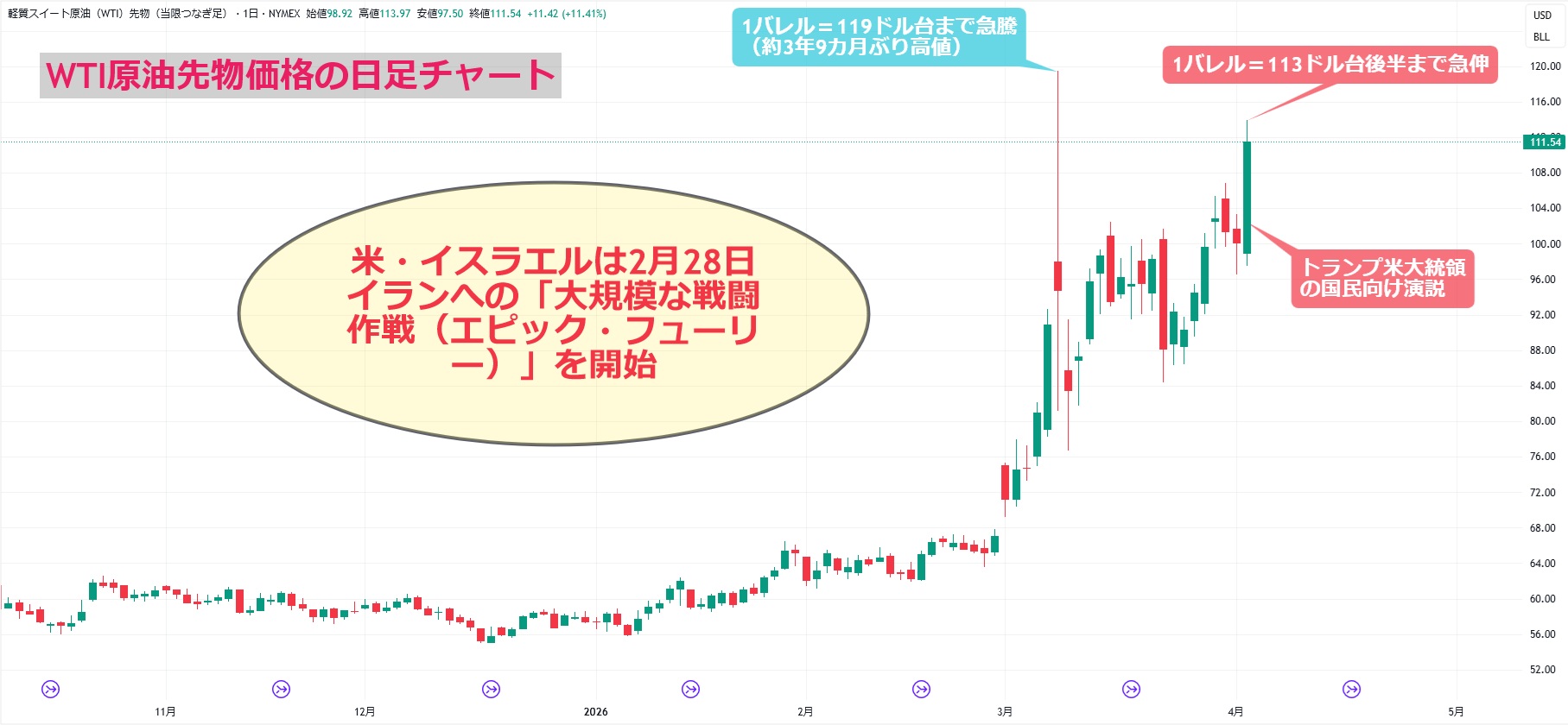 トランプ米大統領の演説を受けて、イランも徹底抗戦の構えを示すと、ホルムズ海峡の通行再開への期待感が剥落。海外市場に入ってもこの流れが継続し、WTI原油先物価格は1バレル=113.97ドル前後まで急騰。欧州株相場や米株価指数先物は下落し、為替市場では「有事のドル買い」が優勢となりました。なお、WTI原油先物は清算値ペースで3年9カ月ぶりの高値をつけています。
