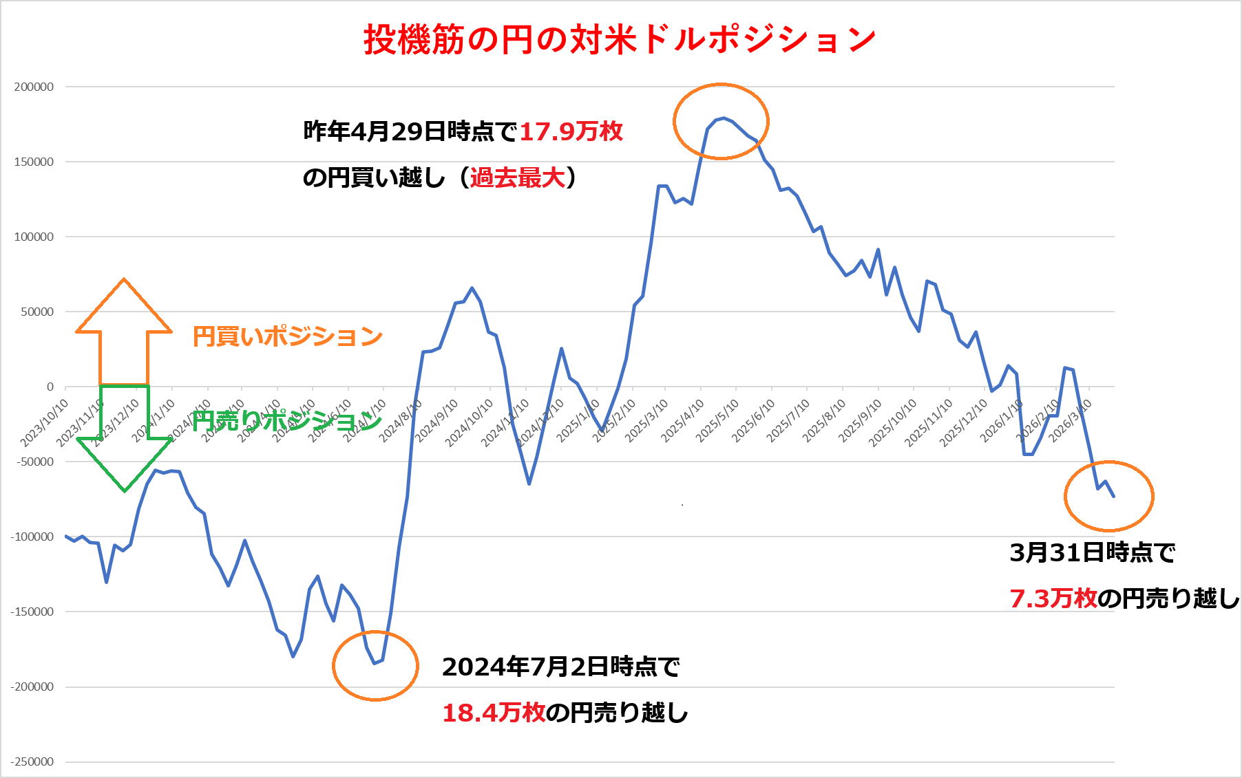 なお、投機筋の円のポジションは昨年7月2日には18万4223枚の円売り越し(ドル円のロング)となり、2007年6月(18万8077枚)以来の高水準を記録していましたが、そのあとは一転して円買いポジションを構築する動きが優勢となり、4月29日には17万9212枚と過去最大を更新しています。ただ、それ以降はその動きが反転。投機筋の円売りポジションが7万枚を超えた水準まで増えています。