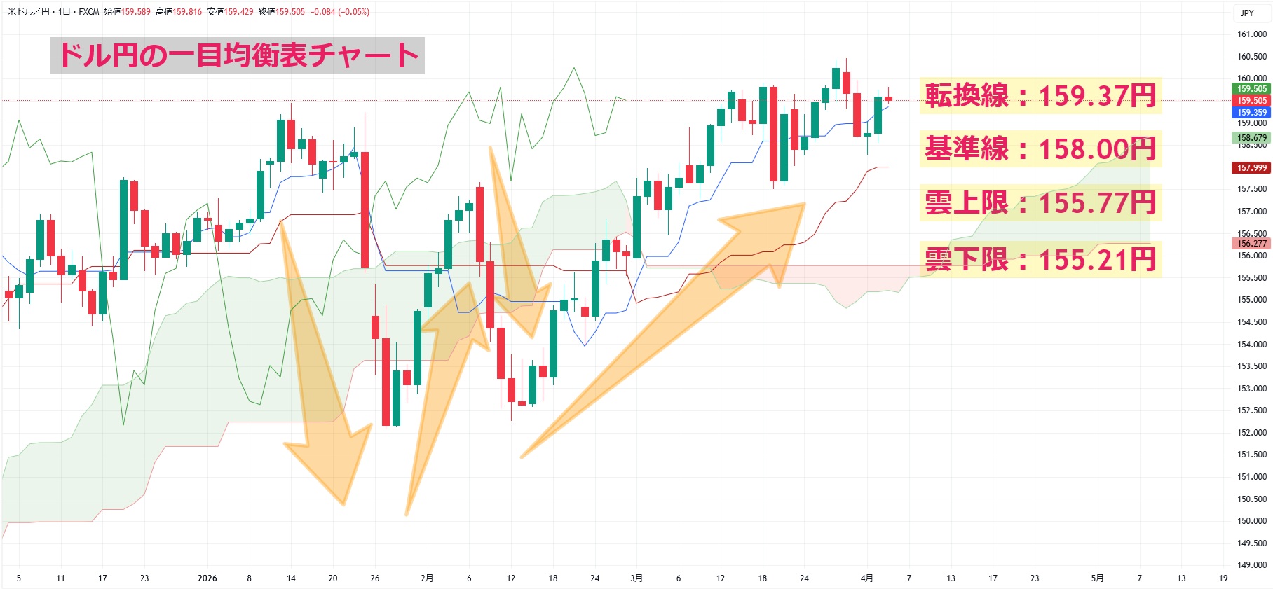 ドル円の一目均衡表チャートを見ると、週末の終値(159.67円)で雲の下限155.21円、上限155.77円、基準線158.00円、転換線159.37円を全て上回っています。雲は非常に薄い状態ですが、テクニカル的に上サイドへの期待が高まる状況です。また、材料的にも「円安」と「ドル高」の両方を備えている状況であり、円安・ドル高のトレンドが続くとみる市場参加者は多いようです。