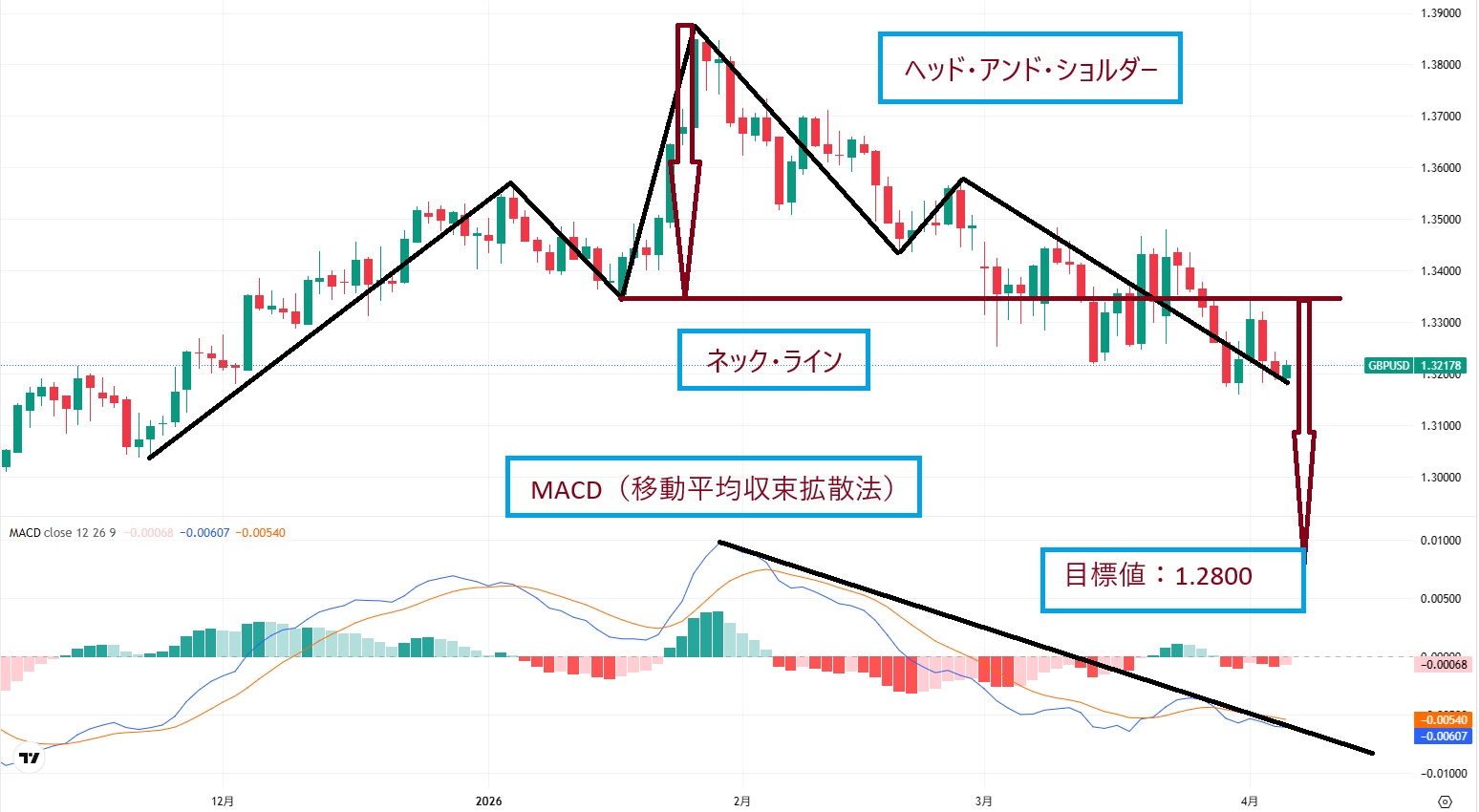 中期的には、下落トレンドの第3波動で2022年9月に1.0356ドルでまで下落した後の調整第4波動による上昇トレンドを形成中でしたが、「ヘッド・アンド・ショルダー」の完成により中期的な支持線を下抜けおり、目標値1.2808ドルが点灯しています。